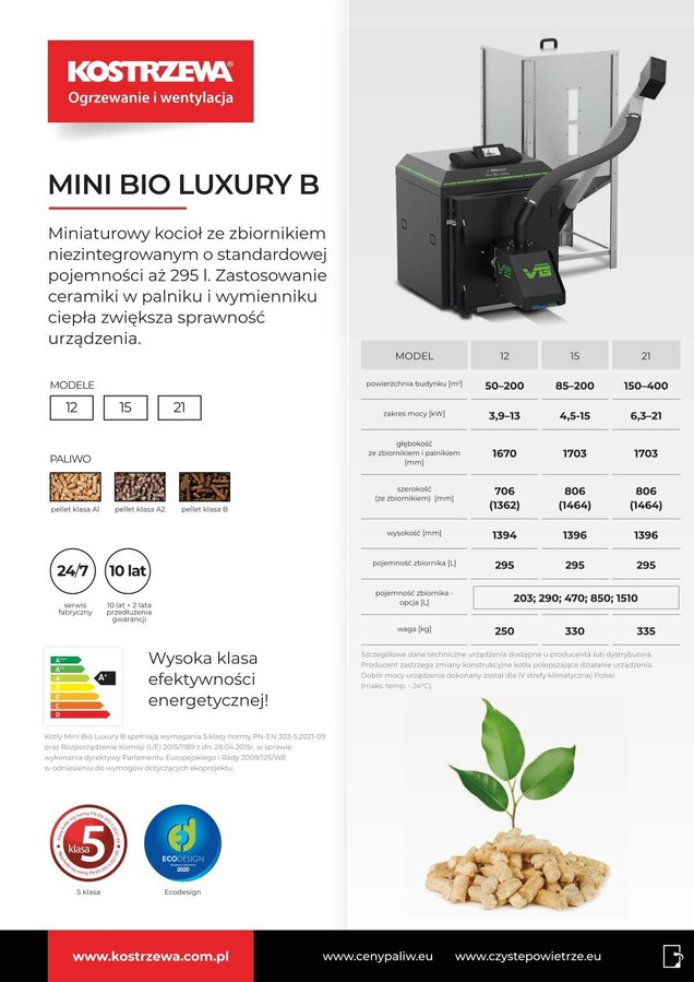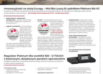 Oferujemy wyjątkowy produkt – miniaturowy kocioł, który posiada wiele zalet. Mini Bio Luxury B ze zbiornikiem niezintegrowanym o standardowej pojemności aż 295 l wytwarza ciepło z każdego rodzaju pelletu (klasa: A1, A2 i B). Jest to możliwe dzięki zastosowaniu innowacyjnego na europejską skalę palnika o zmiennej geometrii Platinum Bio VG. Zastosowanie ceramiki w palniku i wymienniku ciepła dodatkowo zwiększa sprawność urządzenia. Dzięki temu zużycie paliwa zostaje ograniczone do minimum.