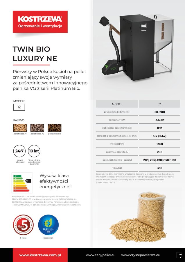 NOWOŚĆ! Twin Bio Luxury NE - Pierwszy w Polsce kocioł na pelet zmieniający swoje wymiary za pośrednictwem innowacyjnego palnika VG z serii Platinum Bio. Spala każdy rodzaj peletu drzewnego (klasa: A1, A2, B)
