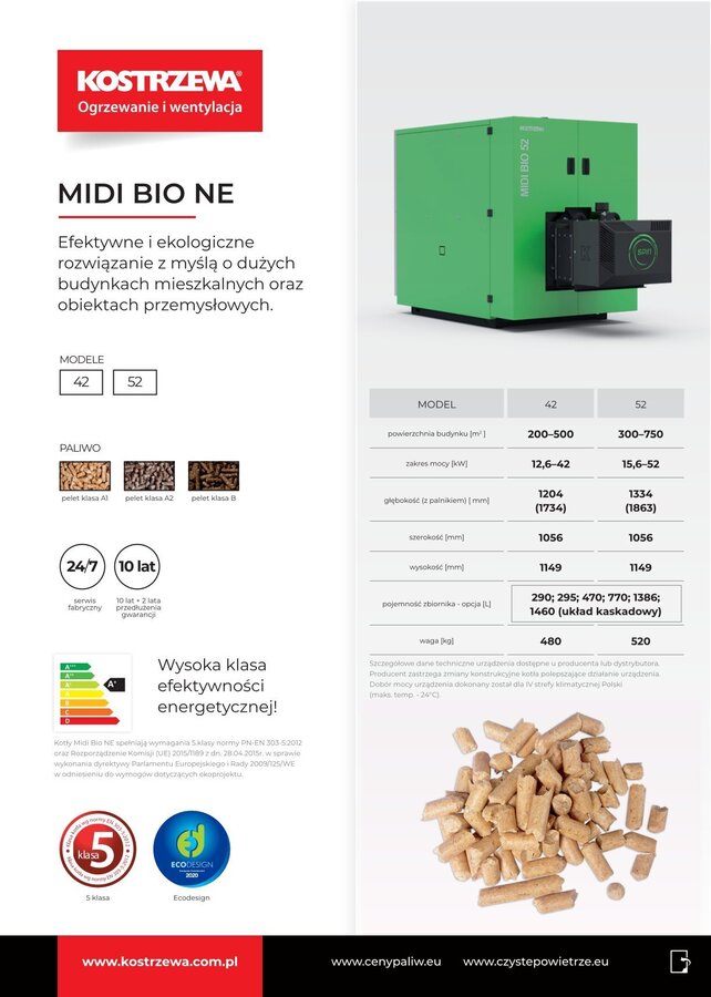 | Rodzaj paliwa | Klasa | Granulat z trocin (pellets wykonany zgodnie zEN 303-5:2012/PN- EN ISO 17225-2 - klasa C1 / A1) Paliwo testowe użyte w procesie certyfikacji - A1. Może również spalać pelet A2 i B. |