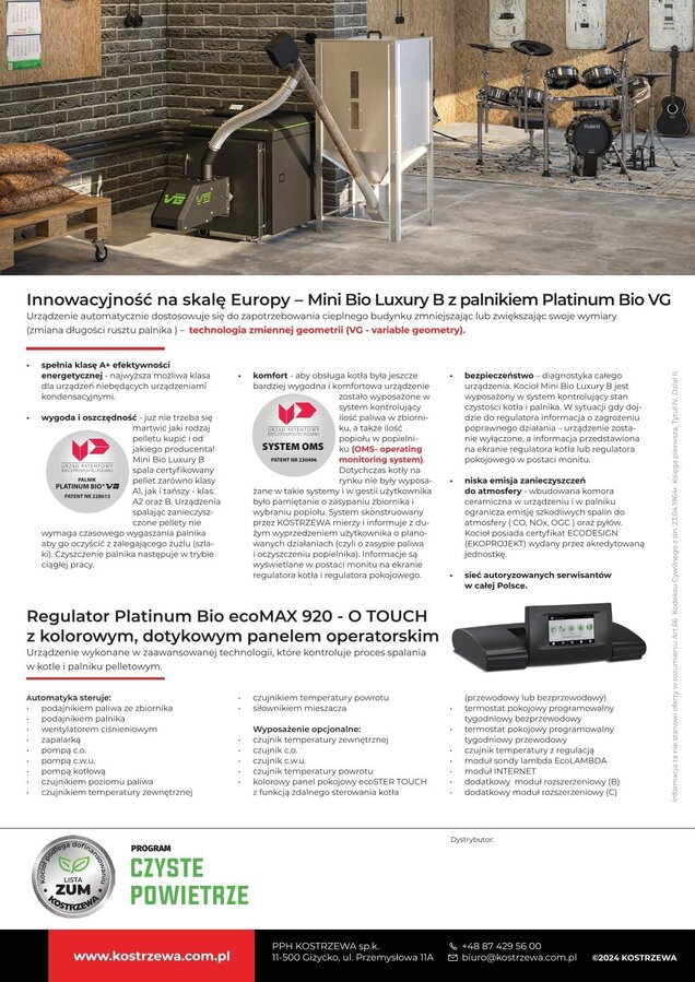 Oferujemy wyjątkowy produkt – miniaturowy kocioł, który posiada wiele zalet. Mini Bio Luxury B ze zbiornikiem niezintegrowanym o standardowej pojemności aż 295 l wytwarza ciepło z każdego rodzaju pelletu (klasa: A1, A2 i B). Jest to możliwe dzięki zastosowaniu innowacyjnego na europejską skalę palnika o zmiennej geometrii Platinum Bio VG. Zastosowanie ceramiki w palniku i wymienniku ciepła dodatkowo zwiększa sprawność urządzenia. Dzięki temu zużycie paliwa zostaje ograniczone do minimum.