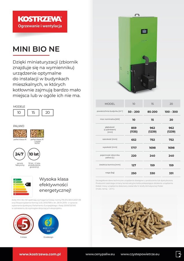 Zaprojektowany po to, by dawać ciepło nawet wtedy, gdy w budynku brakuje kotłowni lub ta istniejąca jest bardzo małych rozmiarów. Znacząca redukcja gabarytów kotła stała się możliwa dzięki zamontowaniu zbiornika na paliwo na wymienniku ciepła. Rozwiązanie zastosowane po raz pierwszy przez Kostrzewę w 2009 r. w flagowym produkcie – kotle Mini Bio doskonale trafiło w potrzeby klienta. W nowej odsłonie klient otrzymuje jeszcze większy komfort, czystość i gwarancję ekonomicznej eksploatacji.