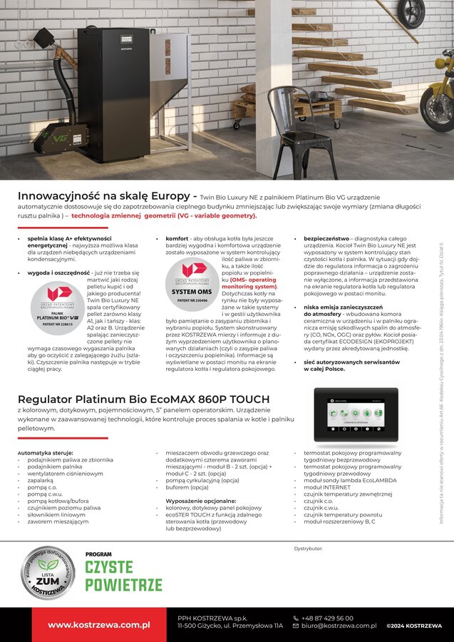 NOWOŚĆ! Twin Bio Luxury NE - Pierwszy w Polsce kocioł na pelet zmieniający swoje wymiary za pośrednictwem innowacyjnego palnika VG z serii Platinum Bio. Spala każdy rodzaj peletu drzewnego (klasa: A1, A2, B)